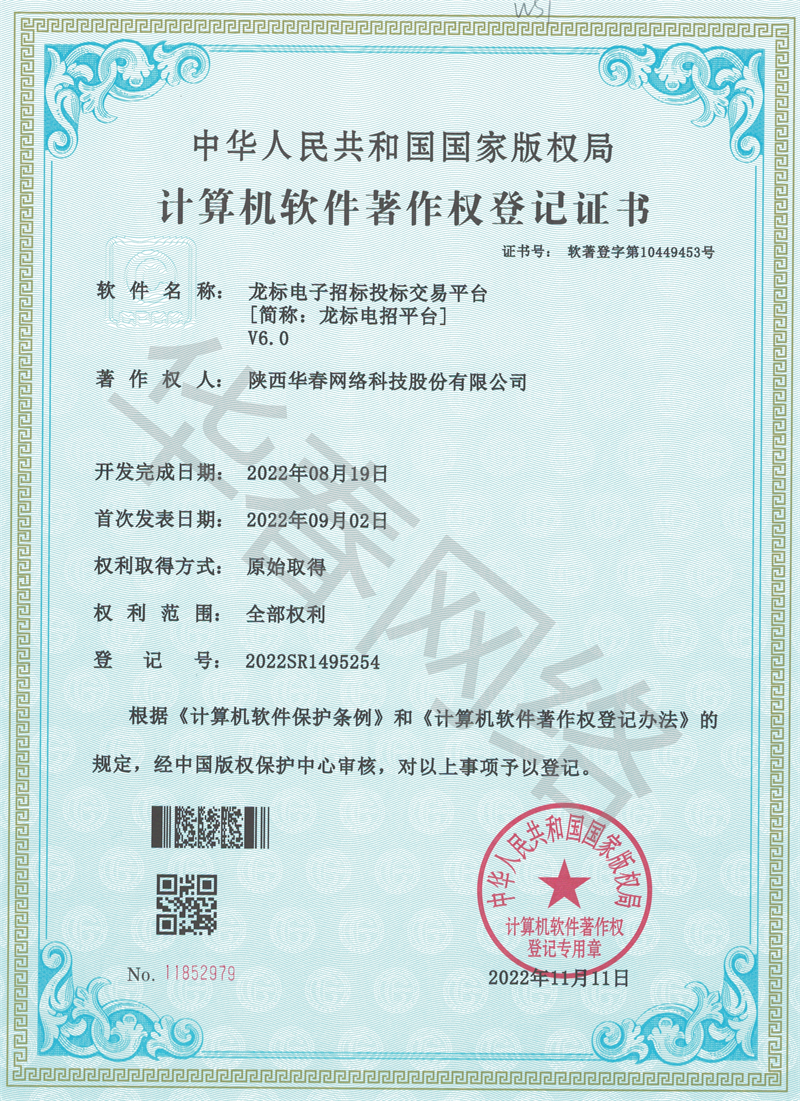 2022年11月11日,陜西華春網絡科技股份有限公司申請的又一項計算機軟件著作權經中國版權保護中心審核通過,成功取得計算機軟件著作權登記證書。